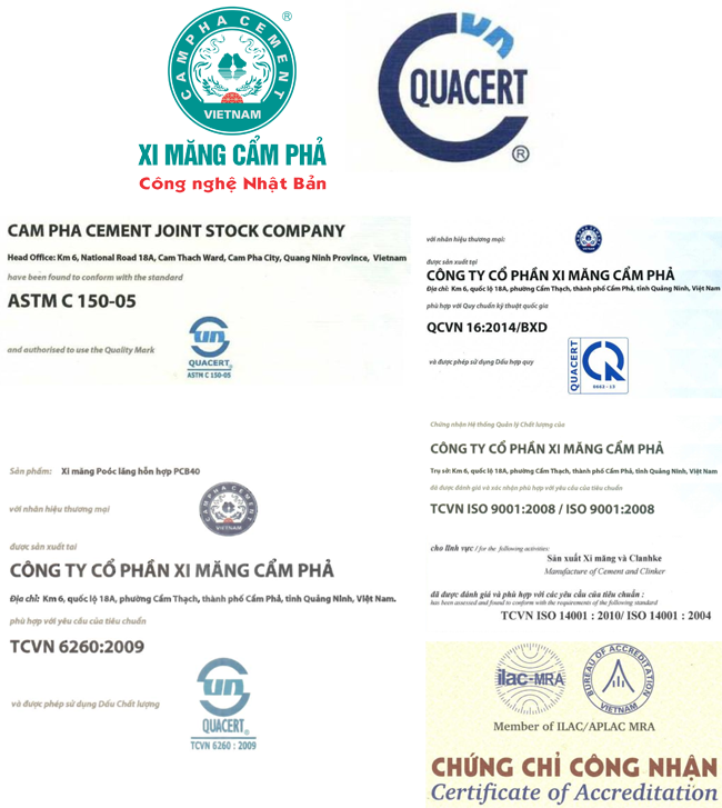 Với các hệ thống kiểm soát chất lượng trên, Công ty Cổ phần Xi măng Cẩm Phả đã được cấp nhiều giấy chứng nhận đạt chuẩn Việt Nam và quốc tế cụ thể: