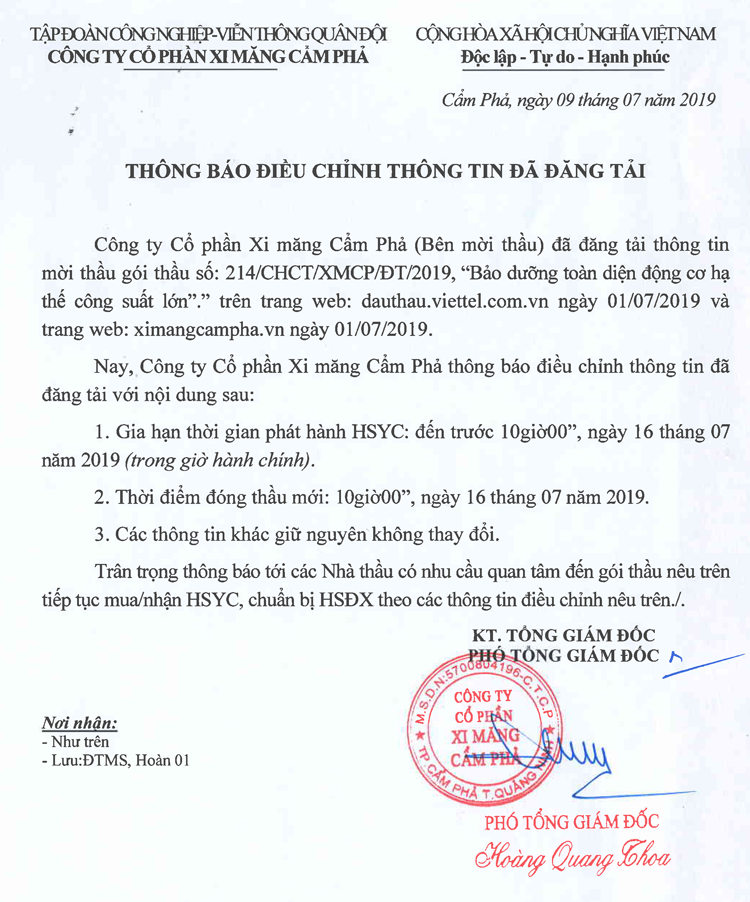 Thông báo điều chỉnh thông tin đã đăng tải gói thầu Bảo dưỡng toàn diện động cơ công suất lớn