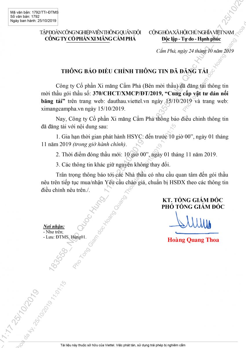 Thông báo điều chỉnh thông tin đã đăng tải gói thầu Cung cấp vật tư dán nối băng tải