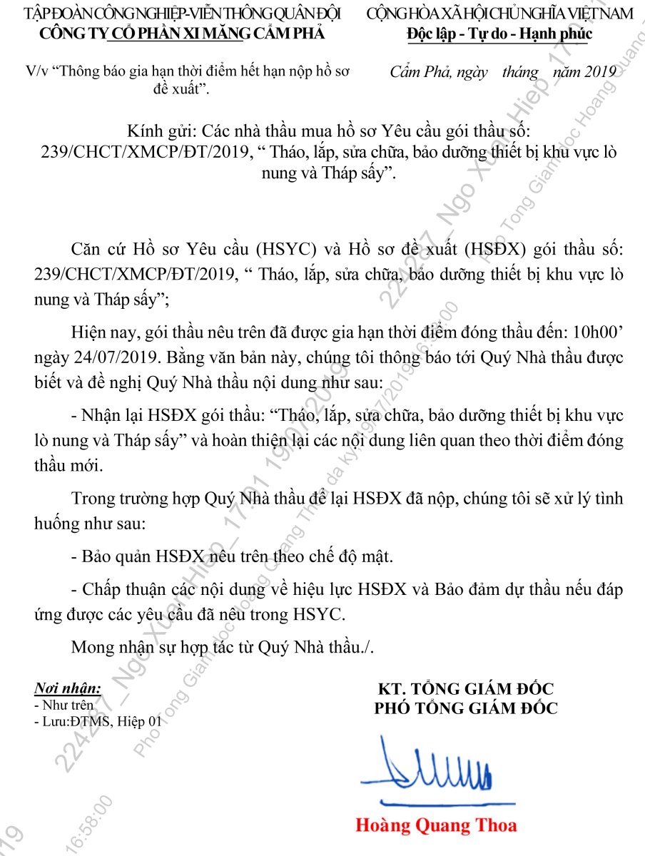 Thông báo gia hạn thời điểm hết hạn nộp hồ sơ đề xuất "Tháo lắp, sửa chữa bảo dưỡng thiết bị khu vực Lò Nung và Tháp Sấy