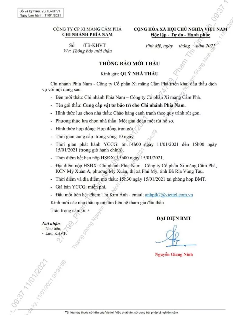 Thông báo mời tham gia Cung cấp Vật tư bảo trì cho Chi nhánh Phía Nam