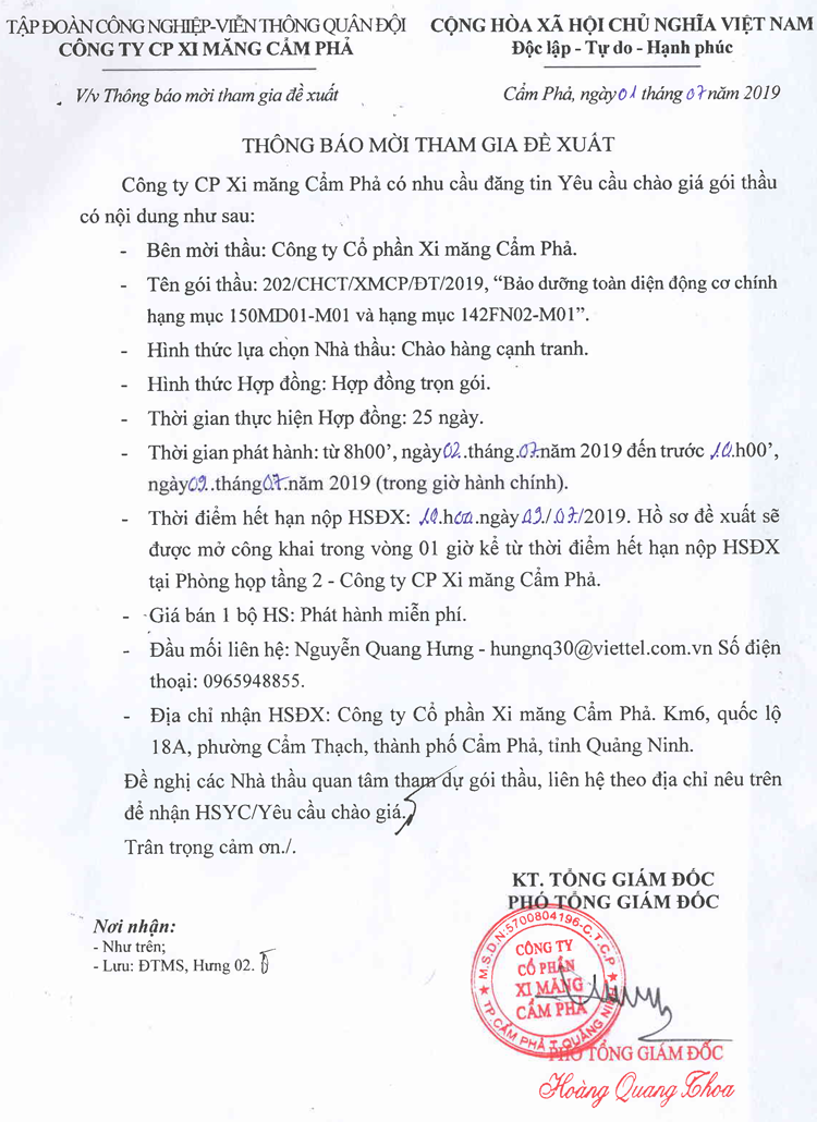 Thông báo mời tham gia đề xuất bảo dưỡng toàn diện động cơ chính hạng mục 150MD01-M01 và 142FN02-M01