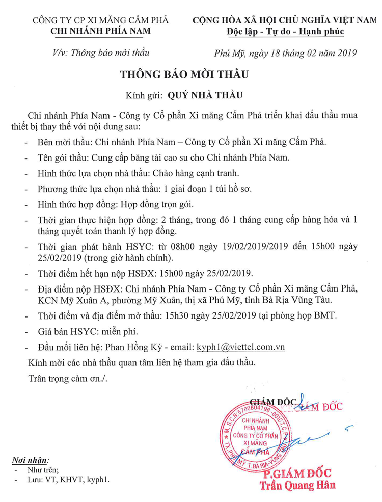 Thông báo mời tham gia đề xuất cung cấp băng tải cao su cho Chi nhánh phía Nam