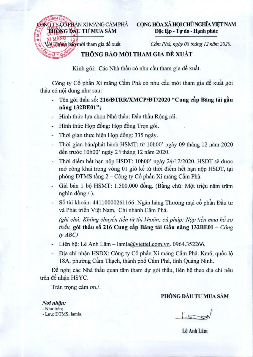 Thông báo mời tham gia đề xuất cung cấp băng tải gầu nâng 132BE01