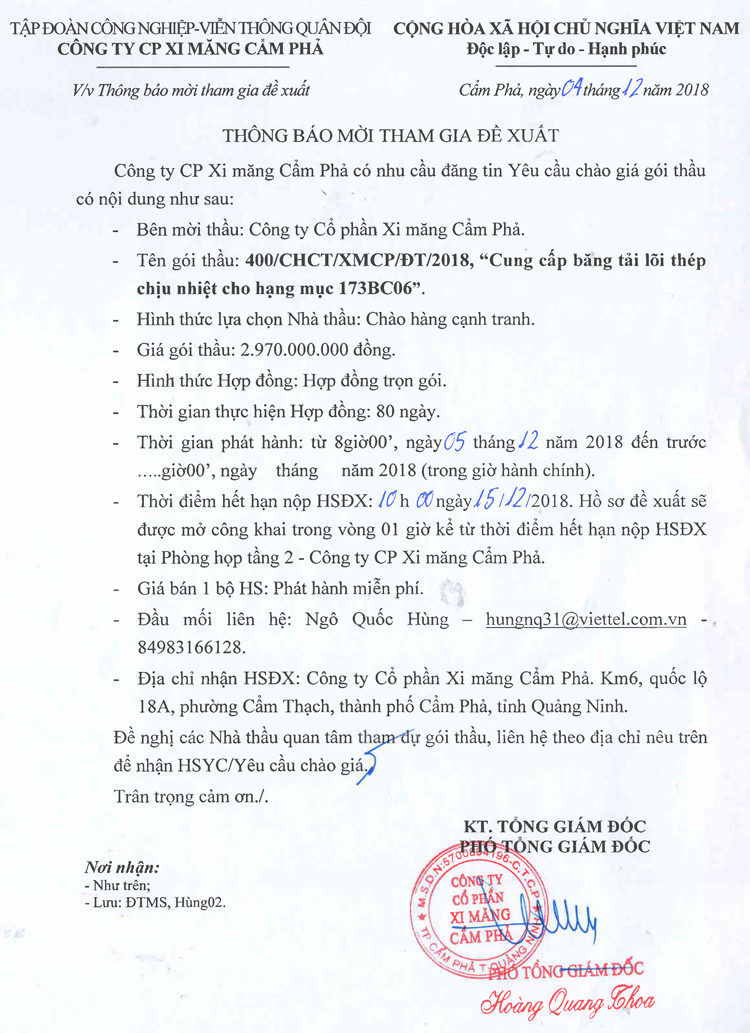 Thông báo mời tham gia đề xuất cung cấp băng tải lõi thép chịu nhiệt cho hạng mục 173BC06