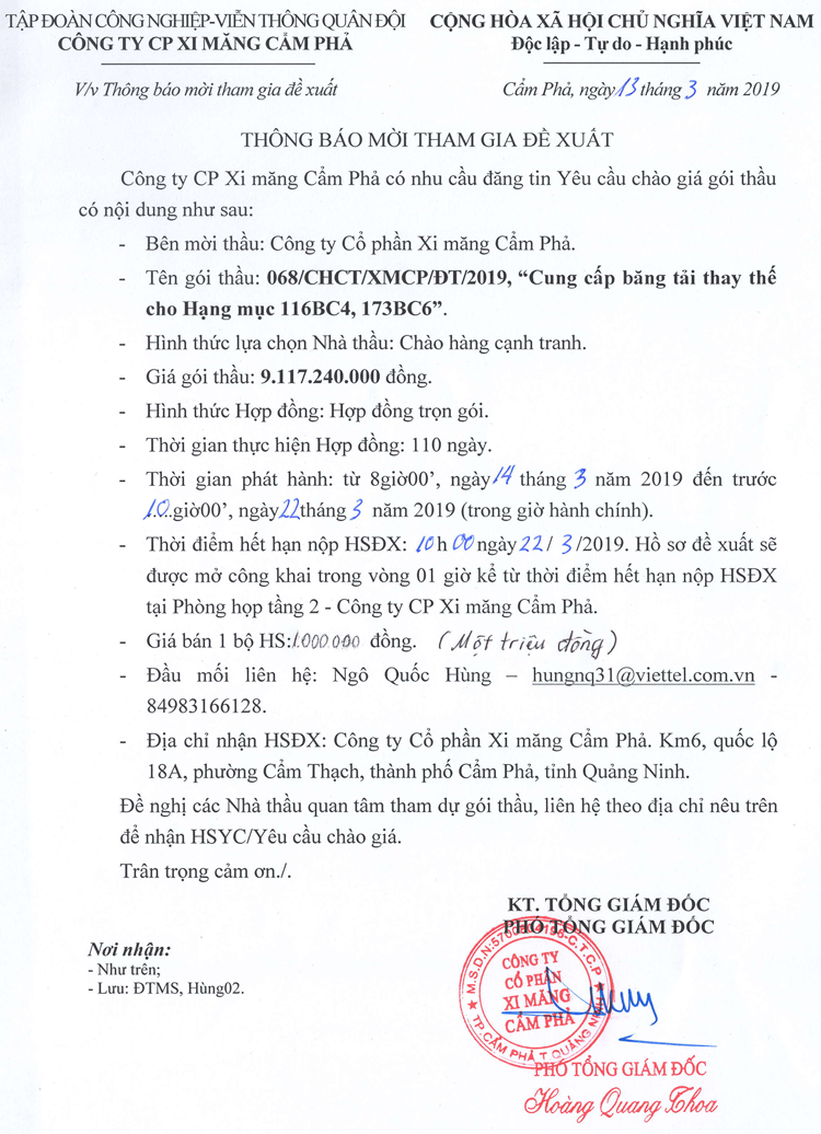 Thông báo mời tham gia đề xuất cung cấp băng tải thay thế cho hạng mục hạng mục 116BC4, 173BC6