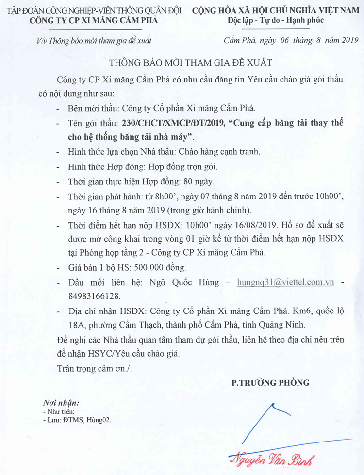 Thông báo mời tham gia đề xuất Cung cấp băng tải thay thế cho hệ thống băng tải nhà máy