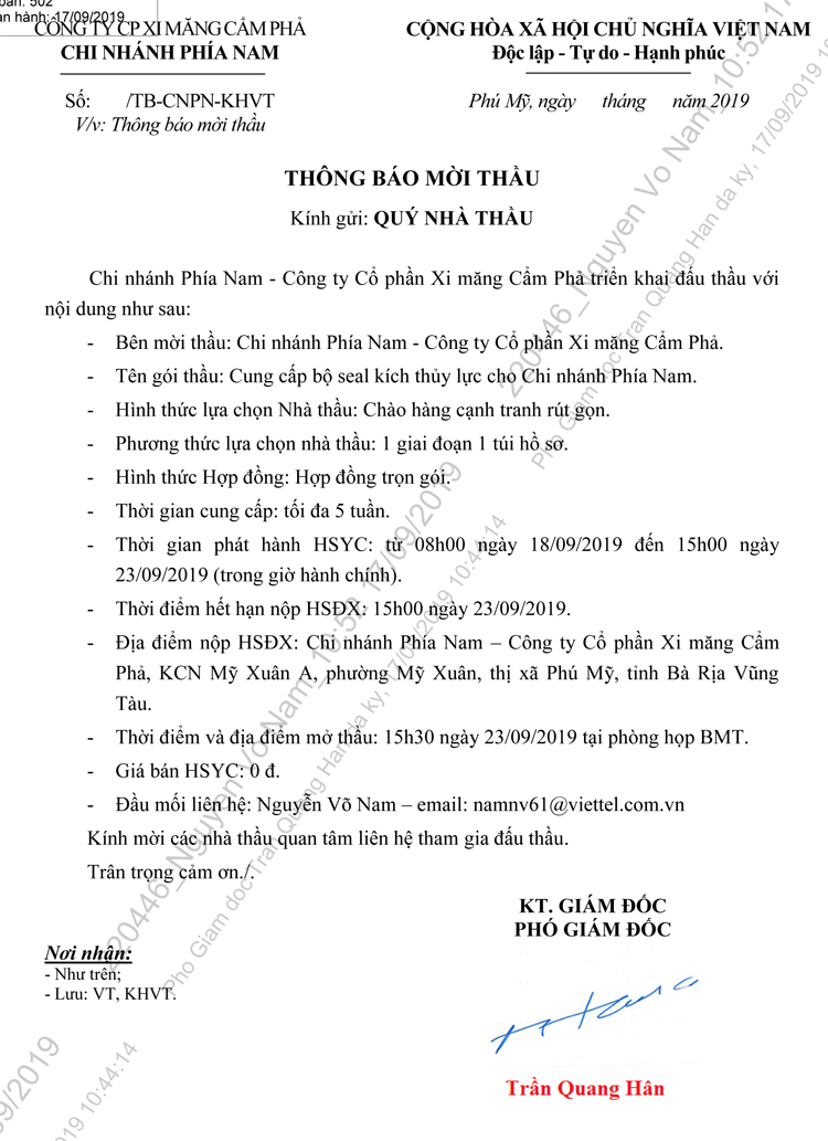 Thông báo mời tham gia đề xuất Cung cấp bộ seal kích thủy lực cho Chi nhánh phía Nam