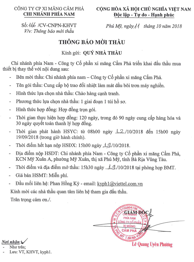 Thông báo mời tham gia đề xuất cung cấp bộ trao đổi nhiệt làm mát dầu bôi trơn máy nghiền