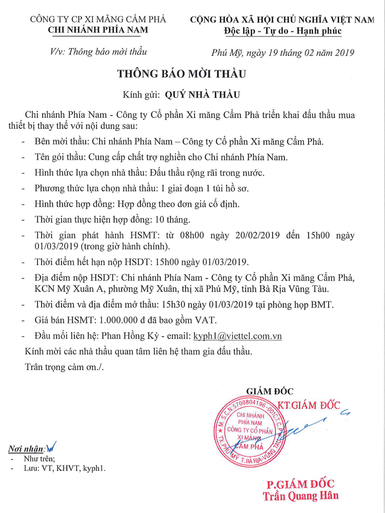 Thông báo mời tham gia đề xuất cung cấp chất trợ nghiền cho Chi nhánh phía Nam