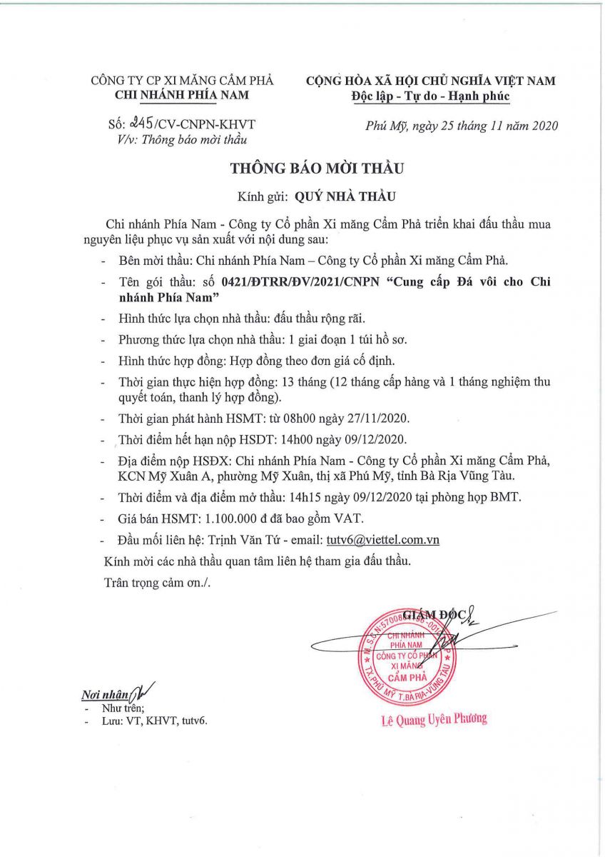 Thông báo mời tham gia đề xuất cung cấp đá vôi cho Chi nhánh Phía Nam