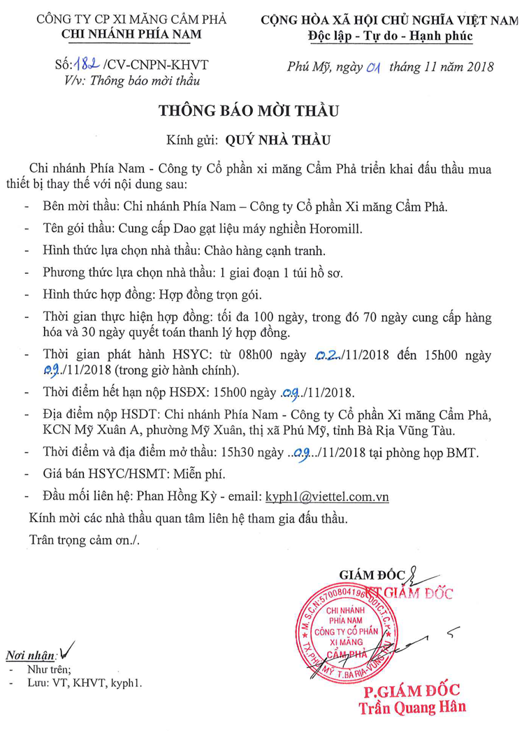Thông báo mời tham gia đề xuất cung cấp Dao gạt liệu máy nghiền Horomill cho chi nhánh phía Nam
