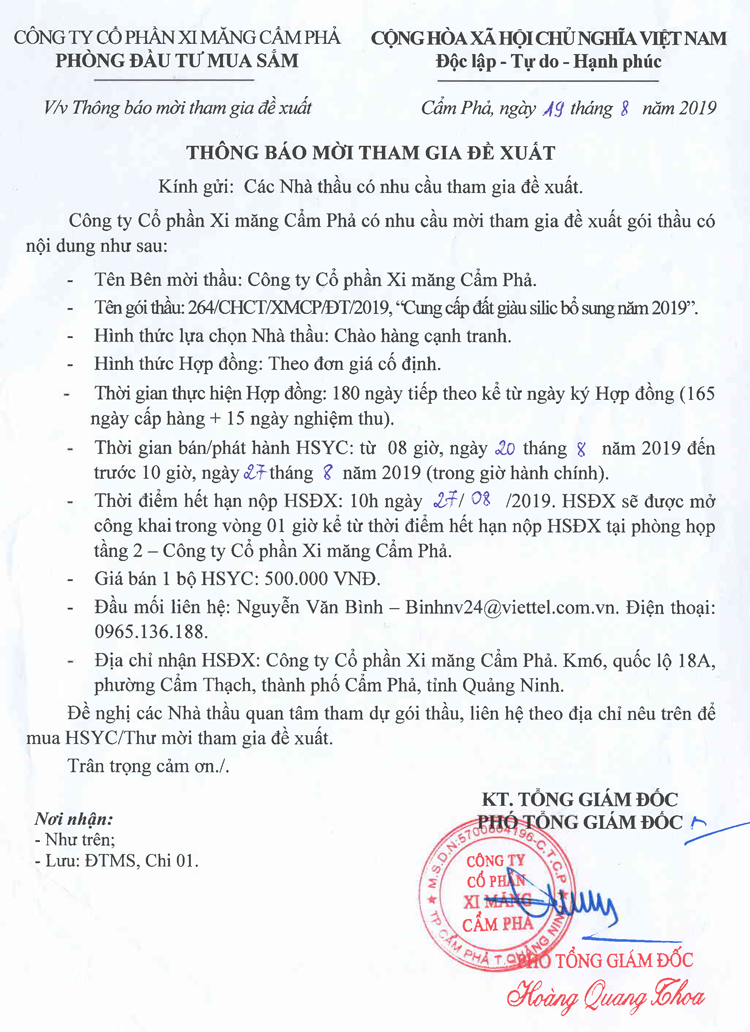 Thông báo mời tham gia đề xuất Cung cấp đất giàu silic bổ sung năm 2019