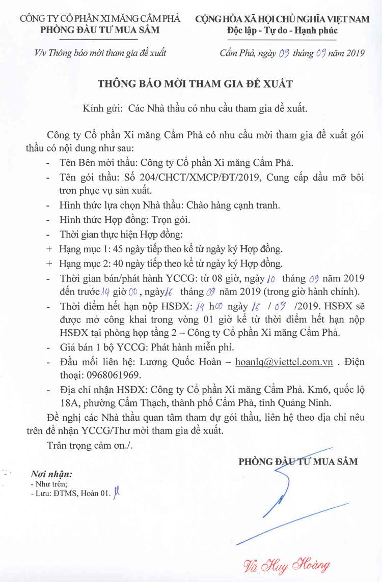 Thông báo mời tham gia đề xuất Cung cấp dầu mỡ bôi trơn phục vụ sản xuất