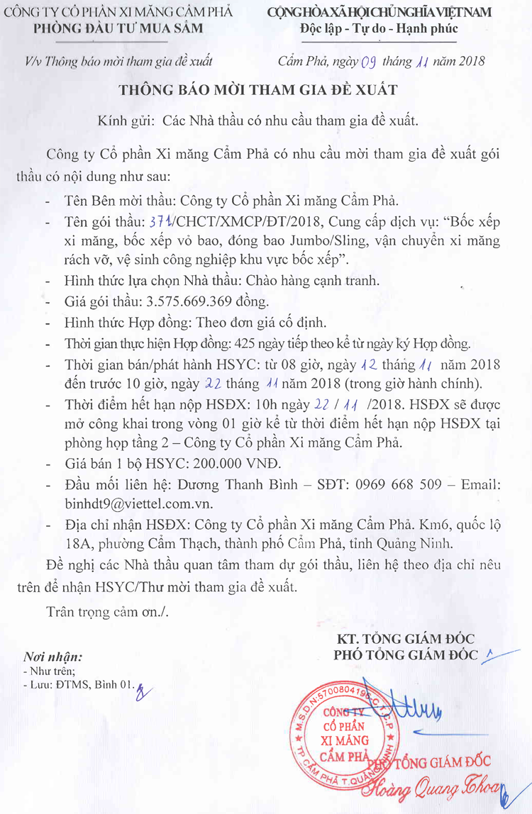 Thông báo mời tham gia đề xuất cung cấp dịch vụ Bốc xếp xi măng, bốc xếp vỏ bao tại nhà máy chính