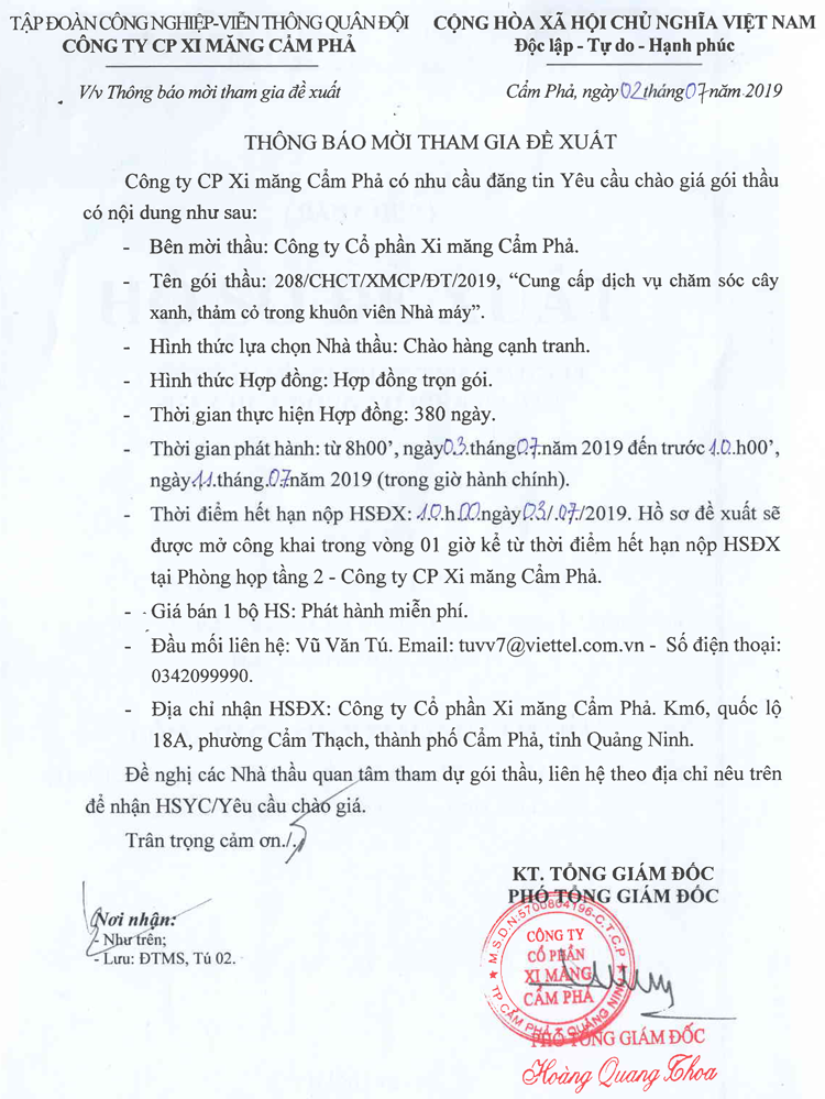 Thông báo mời tham gia đề xuất cung cấp dịch vụ chăm sóc cây xanh, thảm cỏ trong khuôn viên Nhà máy
