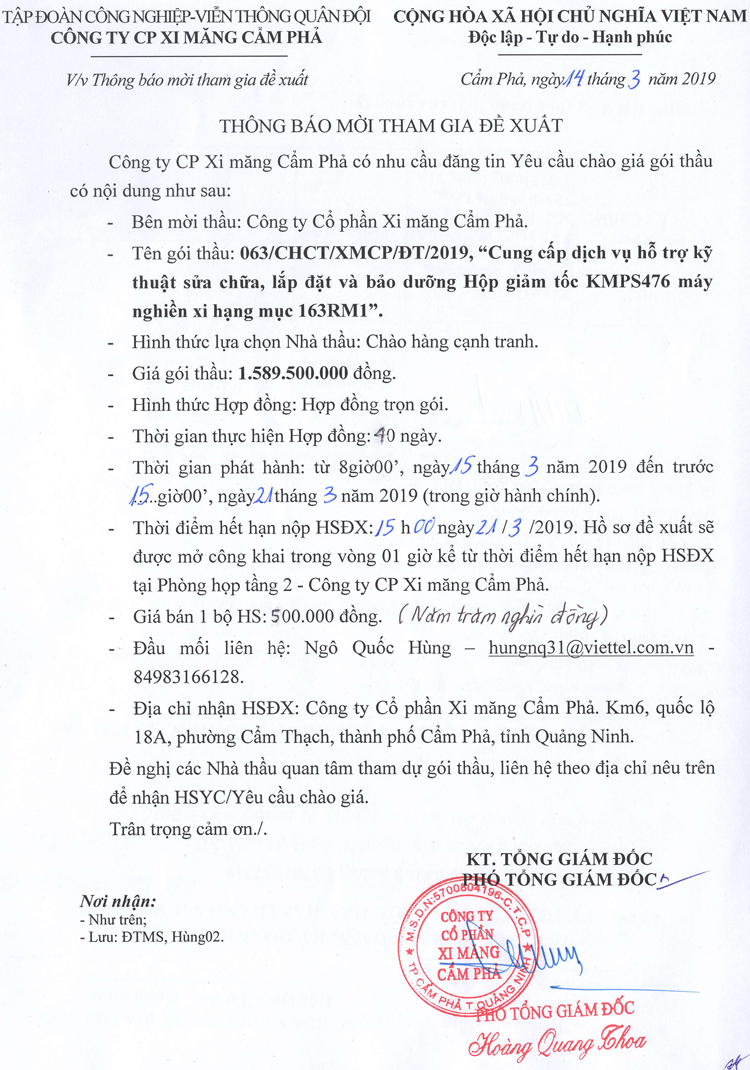 Thông báo mời tham gia đề xuất cung cấp dịch vụ hỗ trợ kỹ thuật sửa chữa, lắp đặt và bảo dưỡng hộp giảm tốc KMPS476 máy nghiền xi hạng mục 163RM1