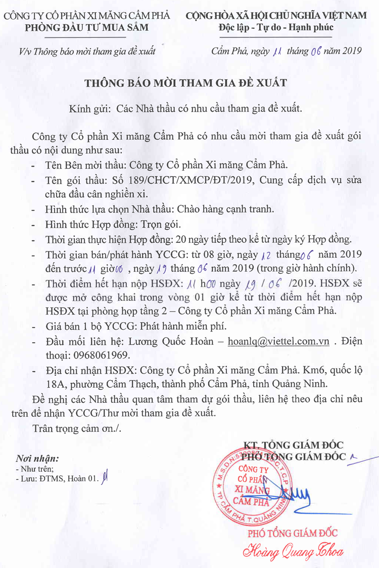 Thông báo mời tham gia đề xuất cung cấp dịch vụ sửa chữa đầu cân nghiền xi