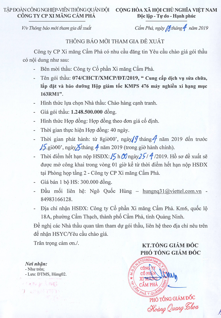 Thông báo mời tham gia đề xuất cung cấp dịch vụ sửa chữa, lắp đặt và bảo dưỡng hộp giảm tốc KMPS 476 máy nghiền hạng mục 163RM1