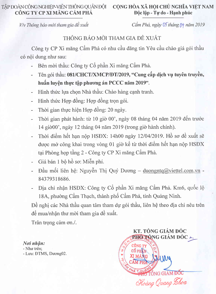 Thông báo mời tham gia đề xuất cung cấp dịch vụ tuyên truyền, huấn luyện thực tập phương án PCCC năm 2019