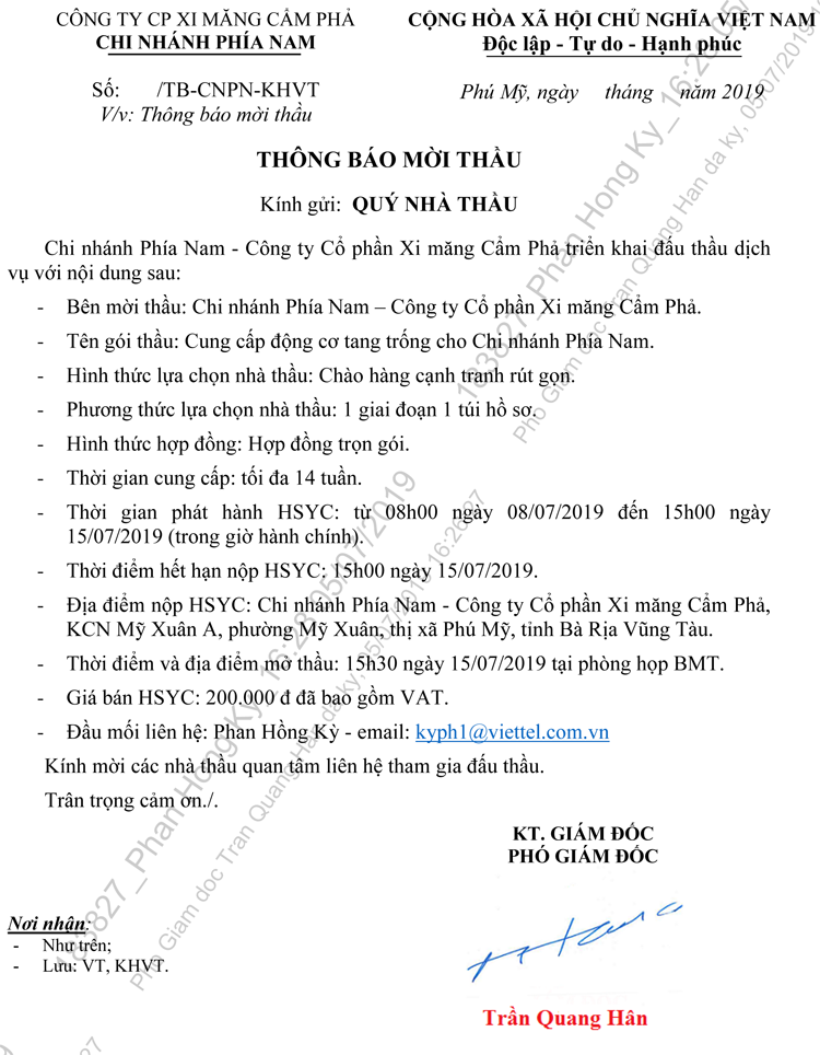 Thông báo mời tham gia đề xuất Cung cấp động cơ tang trống cho Chi nhánh Phía Nam