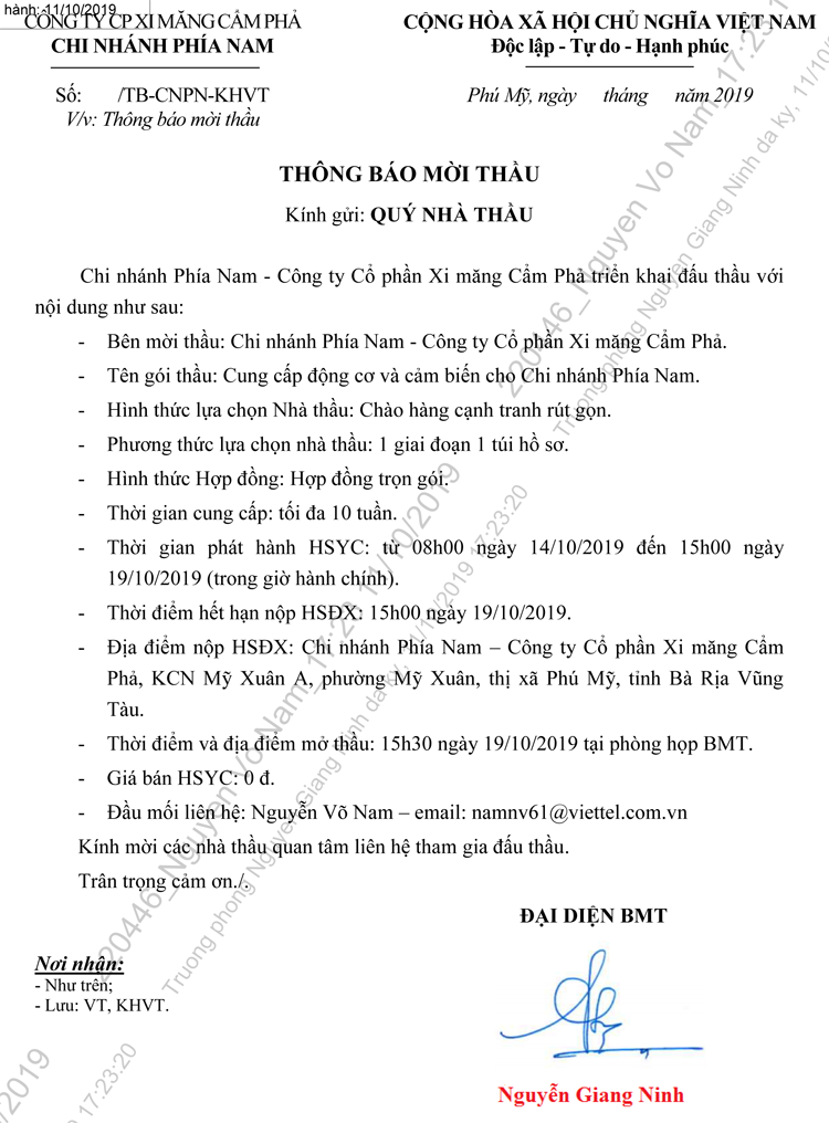 Thông báo mời tham gia đề xuất Cung cấp động cơ và cảm biến cho Chi nhánh phía Nam