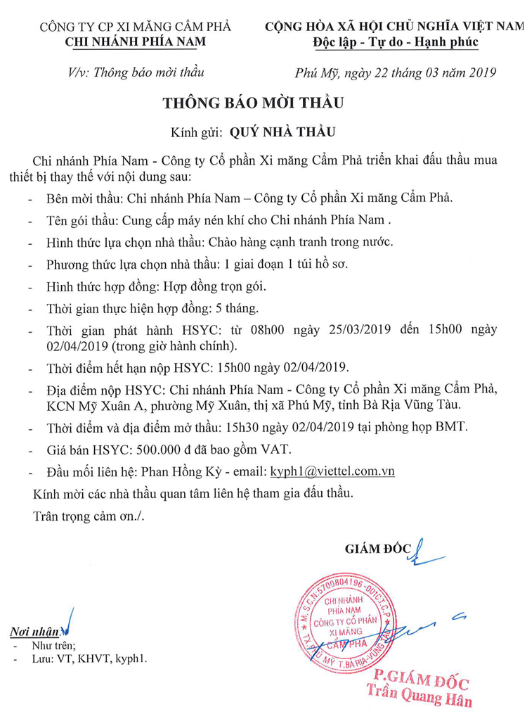 Thông báo mời tham gia đề xuất cung cấp máy nén khí cho Chi nhánh phía Nam