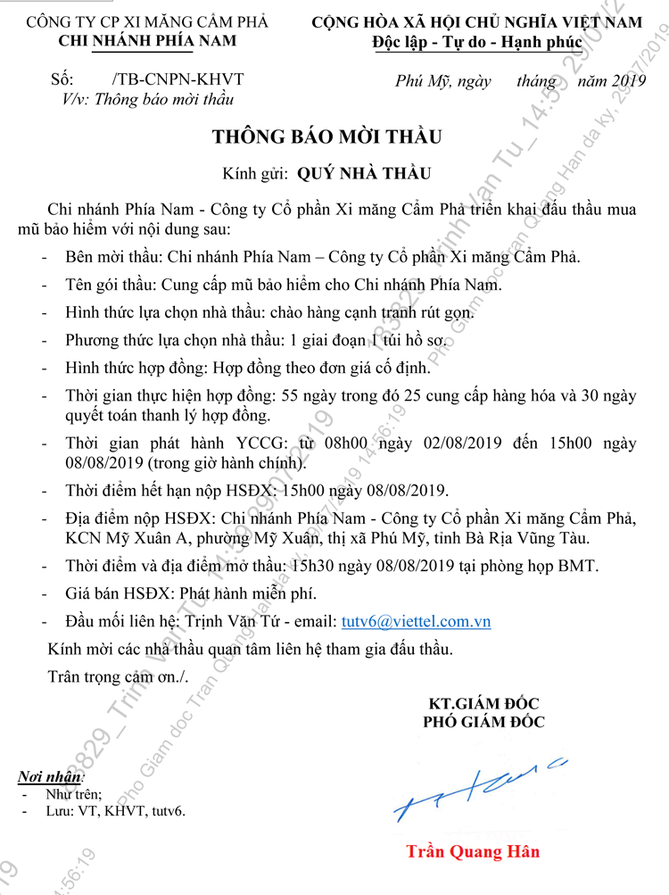Thông báo mời tham gia đề xuất cung cấp mũ bảo hiểm cho Chi nhánh phía Nam
