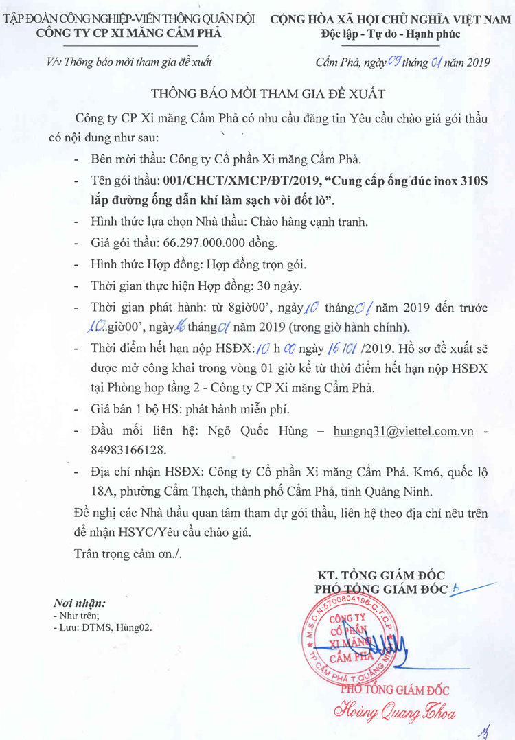 Thông báo mời tham gia đề xuất cung cấp ống đúc Inox 310S lắp đặt đường ống dẫn khí làm sạch vòi đốt lò