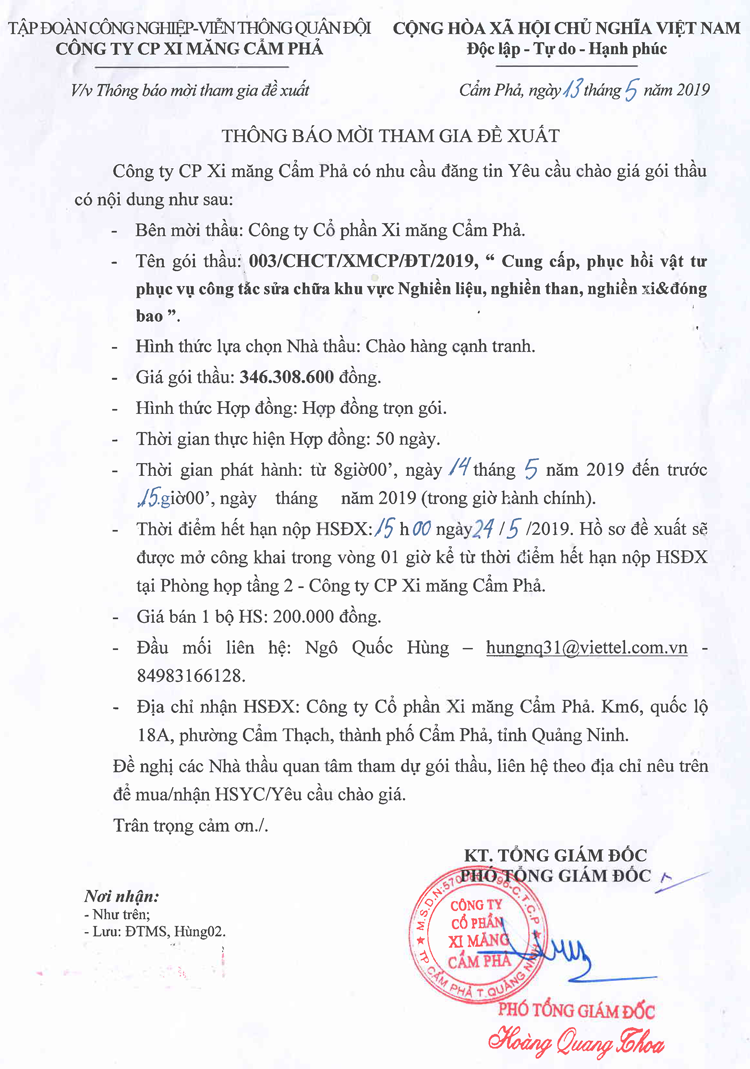 Thông báo mời tham gia đề xuất cung cấp, phục hồi vật tư phục vụ công tác sửa chữa khu vực Nghiền Liệu, Nghiền Than, Nghiền Xi và đóng bao