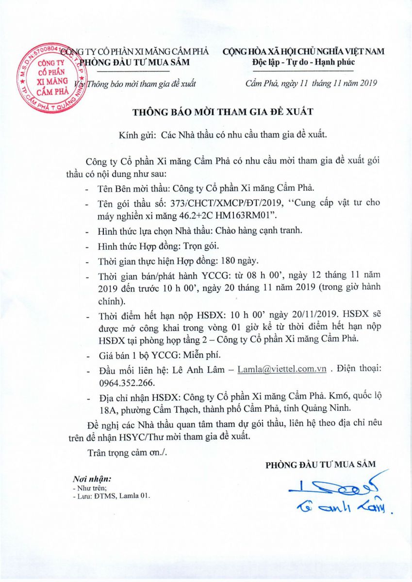 Thông báo mời tham gia đề xuất cung cấp vật tư cho máy nghiền xi măng 46.2+2C HM163RM01