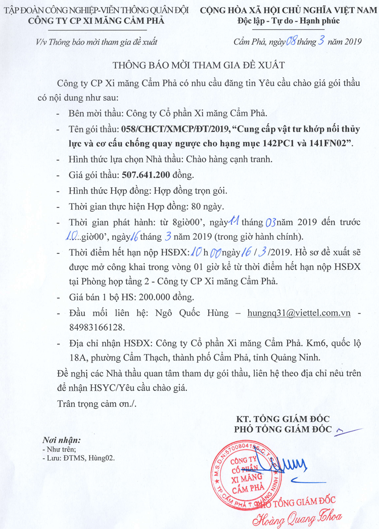 Thông báo mời tham gia đề xuất cung cấp vật tư khớp nối thủy lực và cơ cấu chống quay ngược cho mạng mục 142PC1 và 141FN02