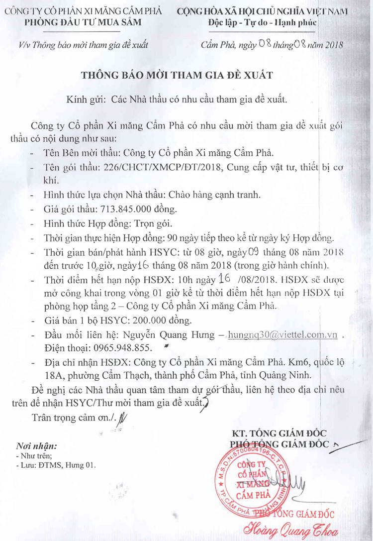 Thông báo mời tham gia đề xuất cung cấp vật tư, thiết bị cơ khí