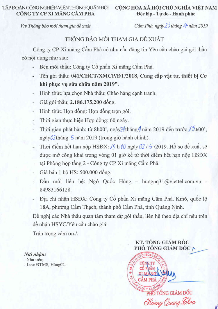 Thông báo mời tham gia đề xuất cung cấp vật tư, thiết bị cơ khí phục vụ sửa chữa năm 2019