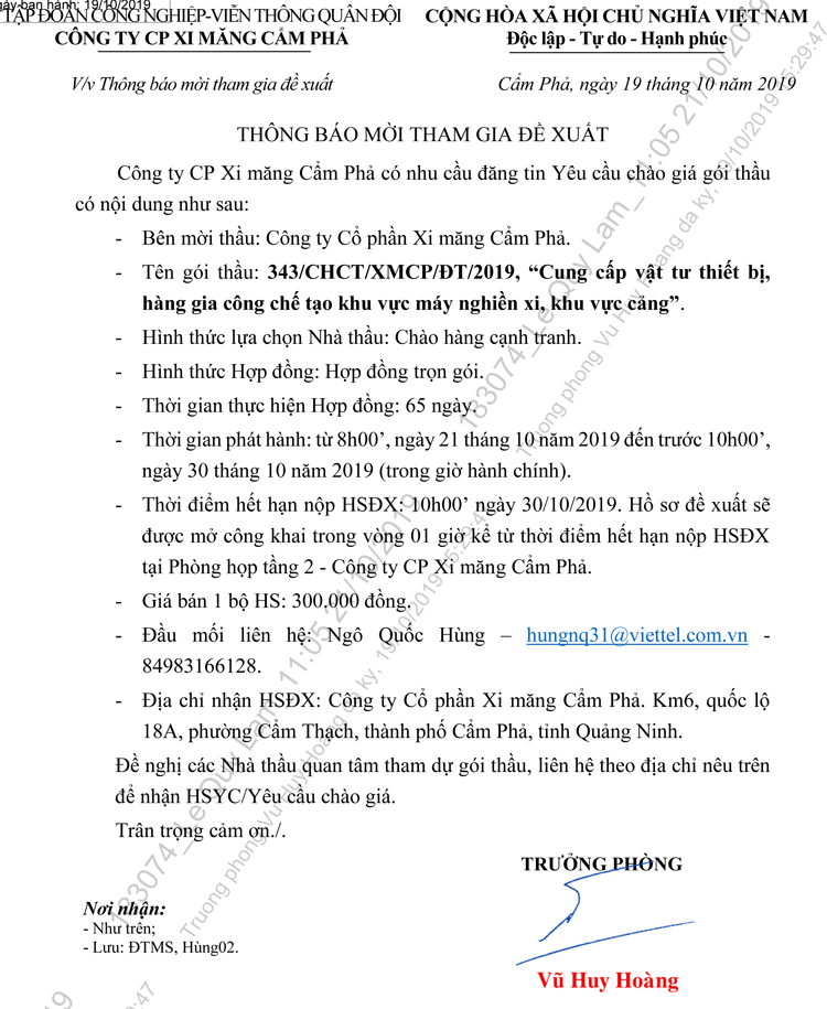 Thông báo mời tham gia đề xuất Cung cấp vật tư thiết bị, hàng gia công chế tạo khu vực máy nghiền xi, khu vực cảng