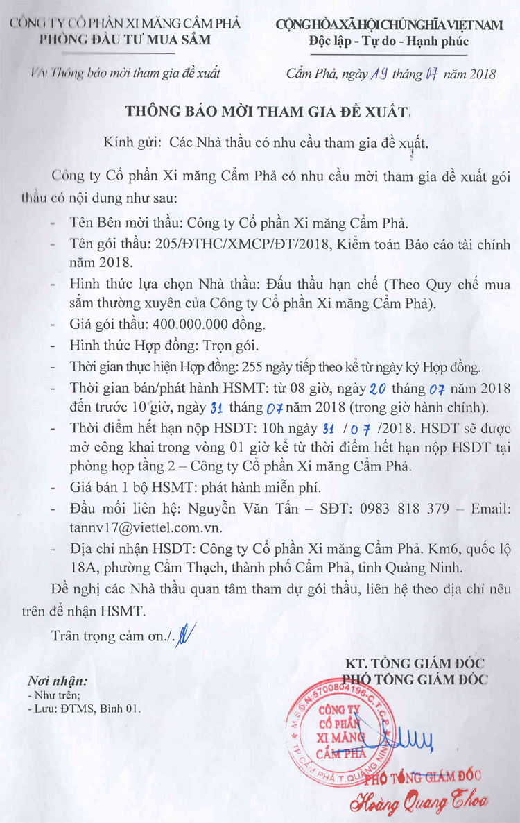 Thông báo mời tham gia đề xuất gói thầu kiểm toán báo cáo tài chính năm 2018