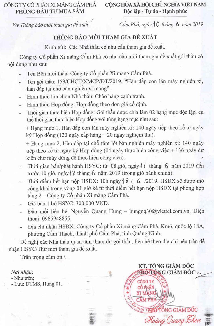 Thông báo mời tham gia đề xuất hàn đắp con lăn máy nghiền xi, hàn đắp tại chỗ bàn nghiền xi măng