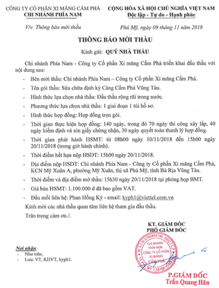 Thông báo mời tham gia đề xuất Sửa chữa định kỳ cảng Cẩm Phả Vũng Tàu