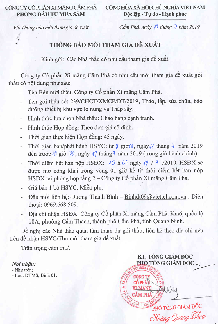 Thông báo mới tham gia đề xuất Tháo lắp, sửa chữa bảo dưỡng thiết bị khu vực lò nung và Tháp sấy