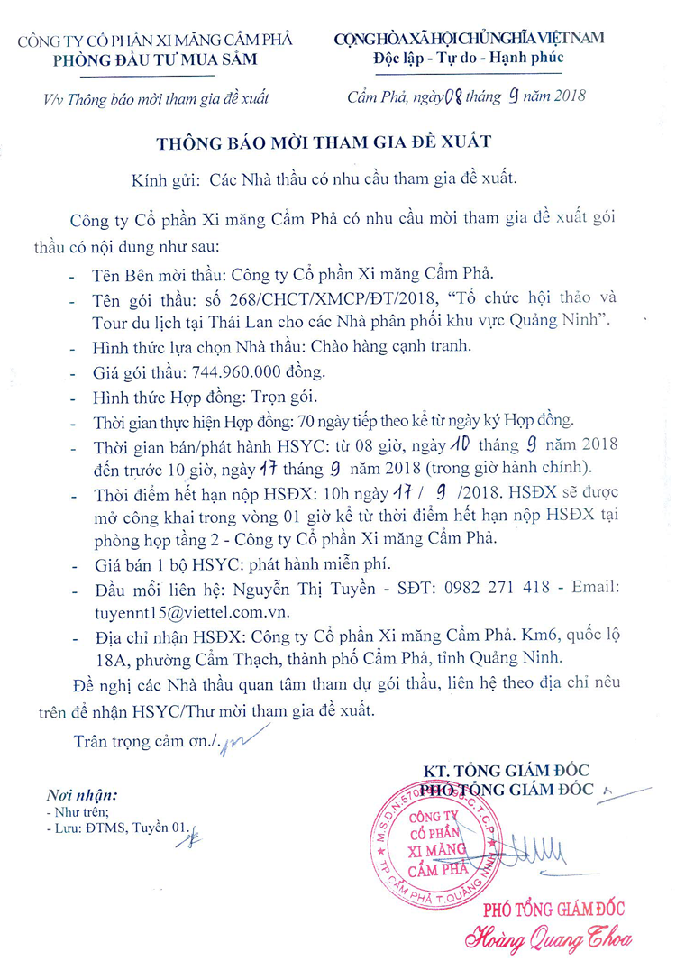 Thông báo mời tham gia đề xuất tổ chức hội thảo và tour du lịch tại Thái Lan cho các nhà phân phối khu vực Quảng Ninh