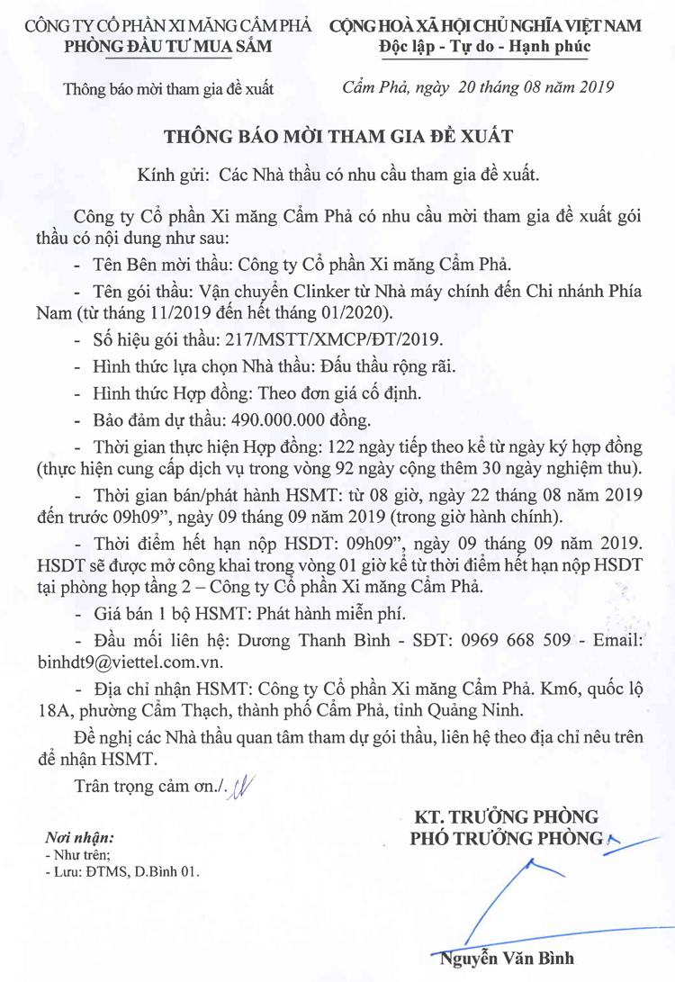 Thông báo mời tham gia đề xuất Vận chuyển Clinker từ Nhà máy chính đến Chi nhánh phía Nam