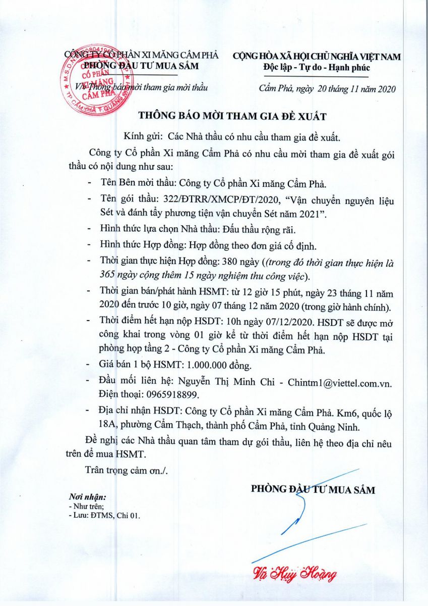 Thông báo mời tham gia đề xuất vận chuyển nguyên liệu sét và đánh tẩy phương tiện vận chuyển sét năm 2021