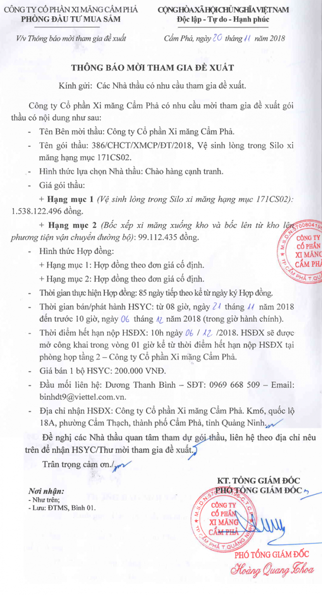 Thông báo mời tham gia thực hiện vệ sinh lòng trong Silo Xi măng hạng mục 171CS02