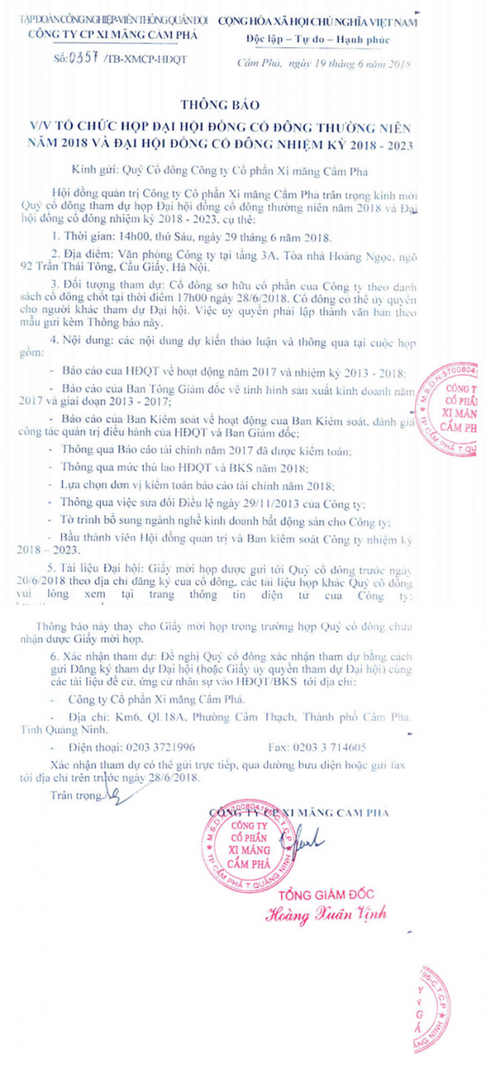 Hội đồng Quản trị Công ty Cổ phần Xi măng Cẩm Phả trân trọng kính mời Quý cổ đông tham dự họp Đại hội đồng Cổ đông thường niên năm 2018 và Đại hội đồng cổ đông nhiệm kỳ 2018 - 2023 cụ thể: