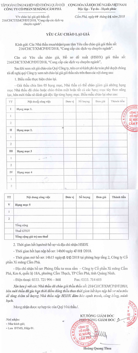 Thông báo yêu cầu chào giá lại gói thầu cung cấp dịch vụ chuyên ngành