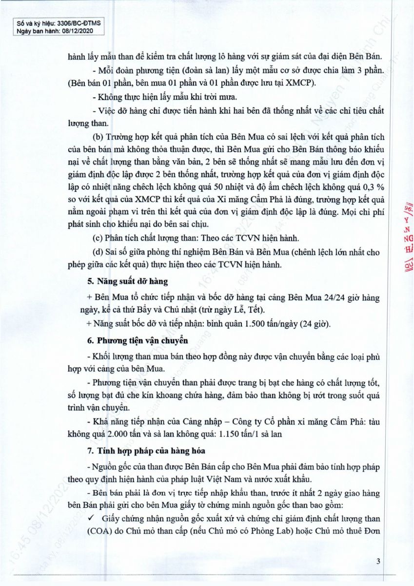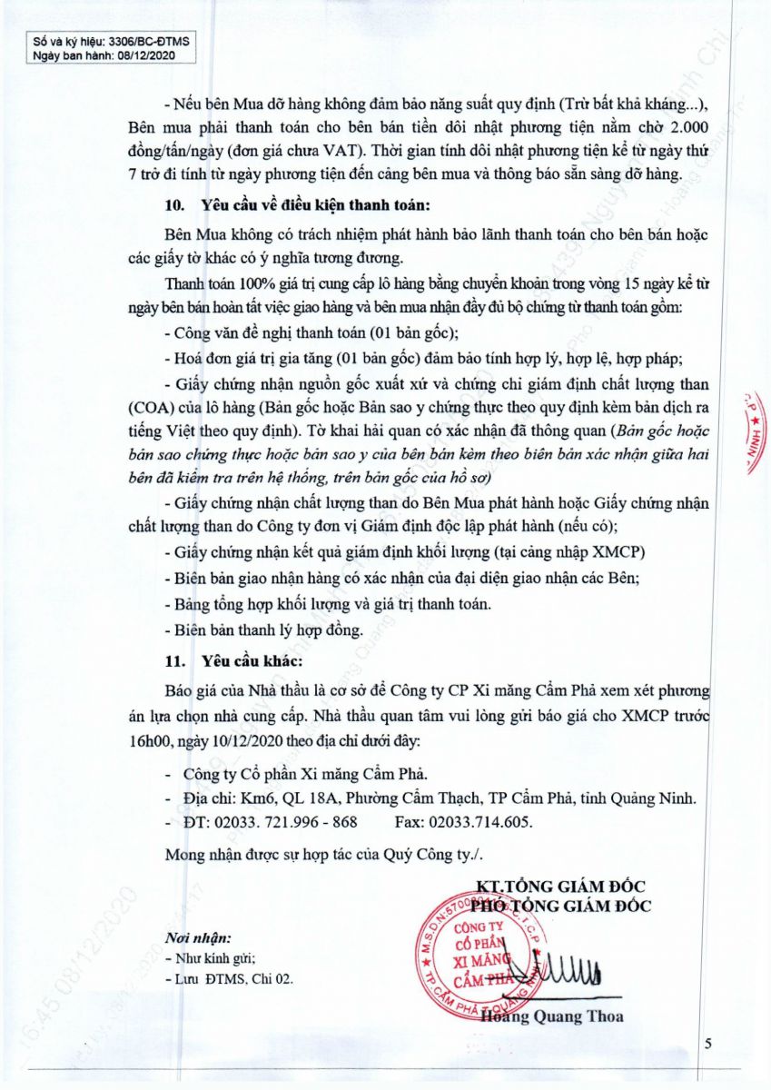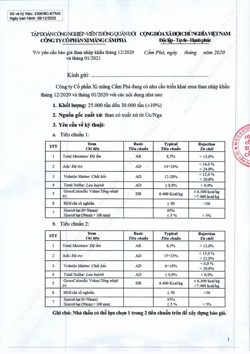 Yêu cầu báo giá than nhập khẩu tháng 12/2020 và tháng 01/2021